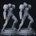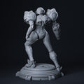 The figurine features futuristic armor plating, detailed helmet sculpting, and an integrated arm cannon with fine textures. The stance conveys stoic readiness without implying motion. Smooth resin surfaces make it ideal for display or custom paintwork.