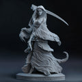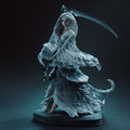 The figurine features flowing, tattered garments, soft fur-lined elements, and delicate draconic details subtly incorporated into the sculpt. The composed posture and calm expression evoke an eerie, otherworldly presence. Smooth resin surfaces allow for crisp paintwork and atmospheric colour palettes.
