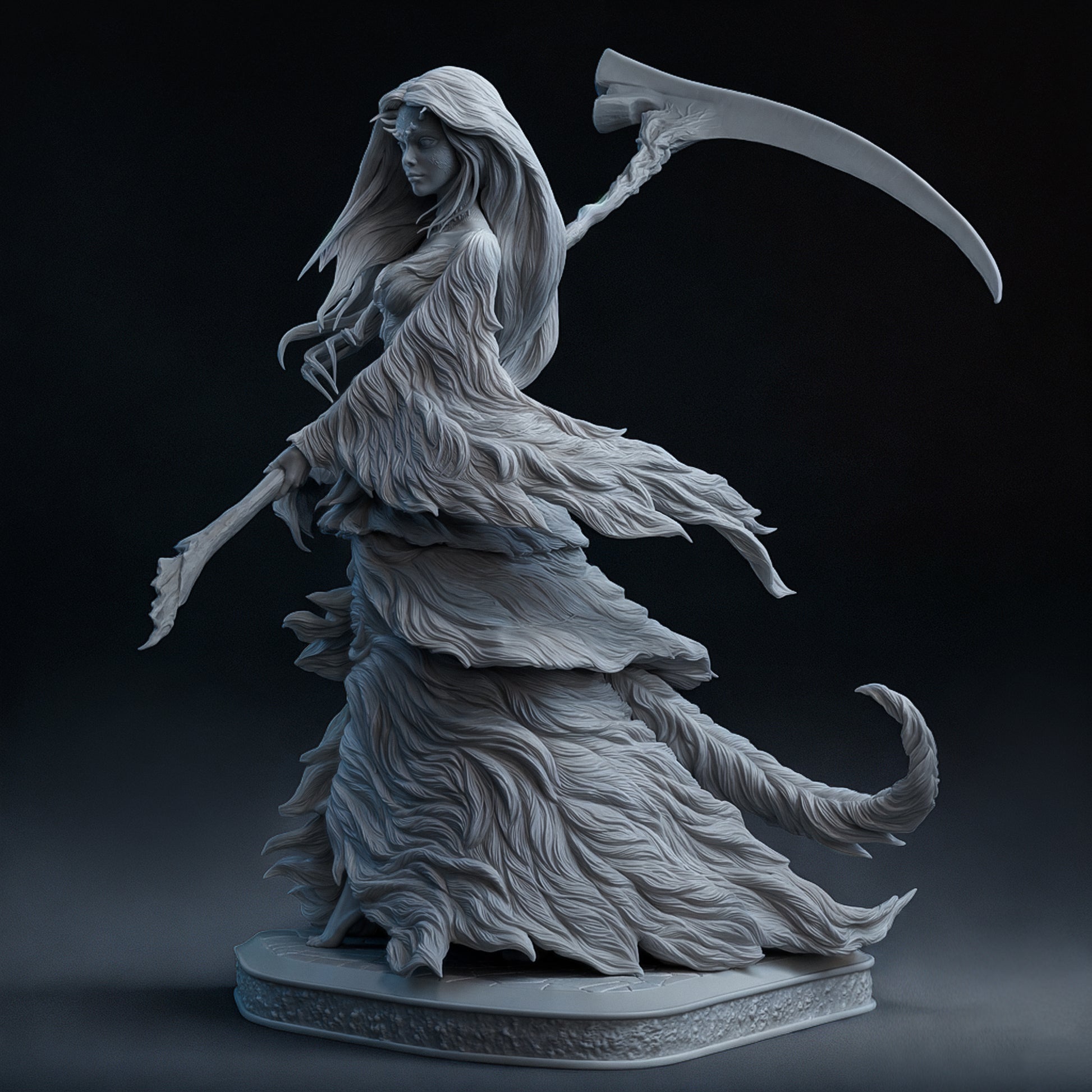 A haunting resin collectable blending ethereal elegance, detailed sculpting, and cold fantasy atmosphere—perfect for any dark fantasy or pop-culture display.