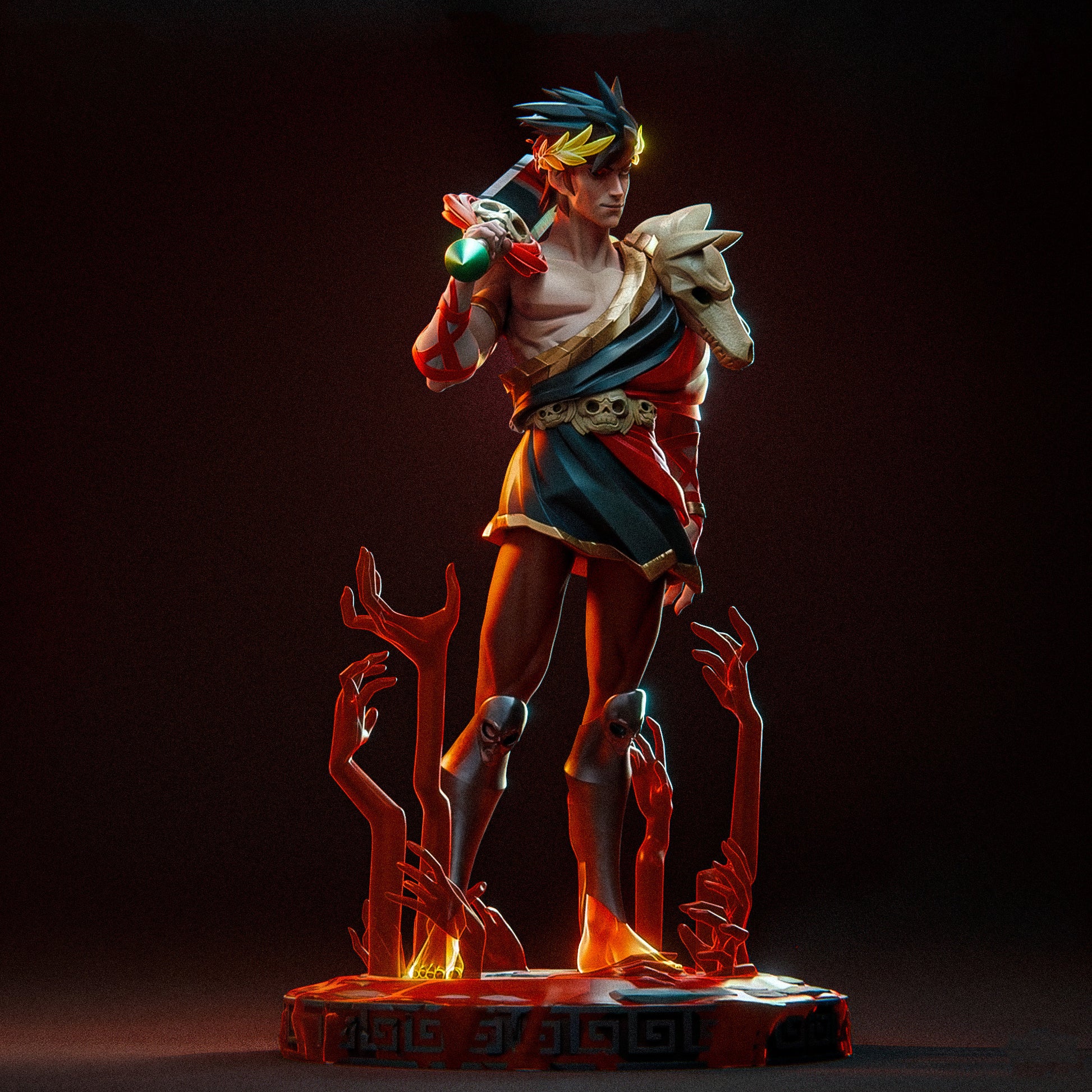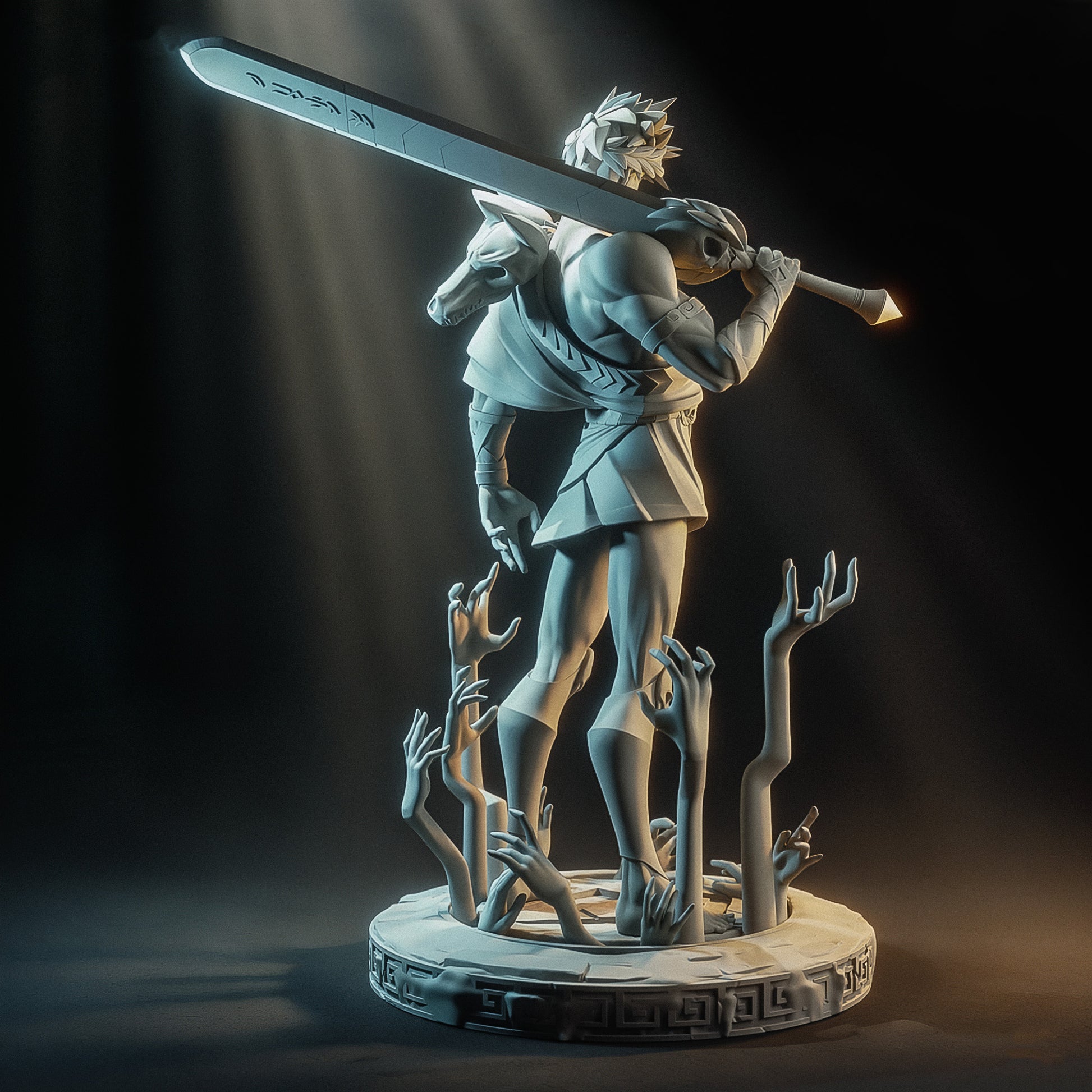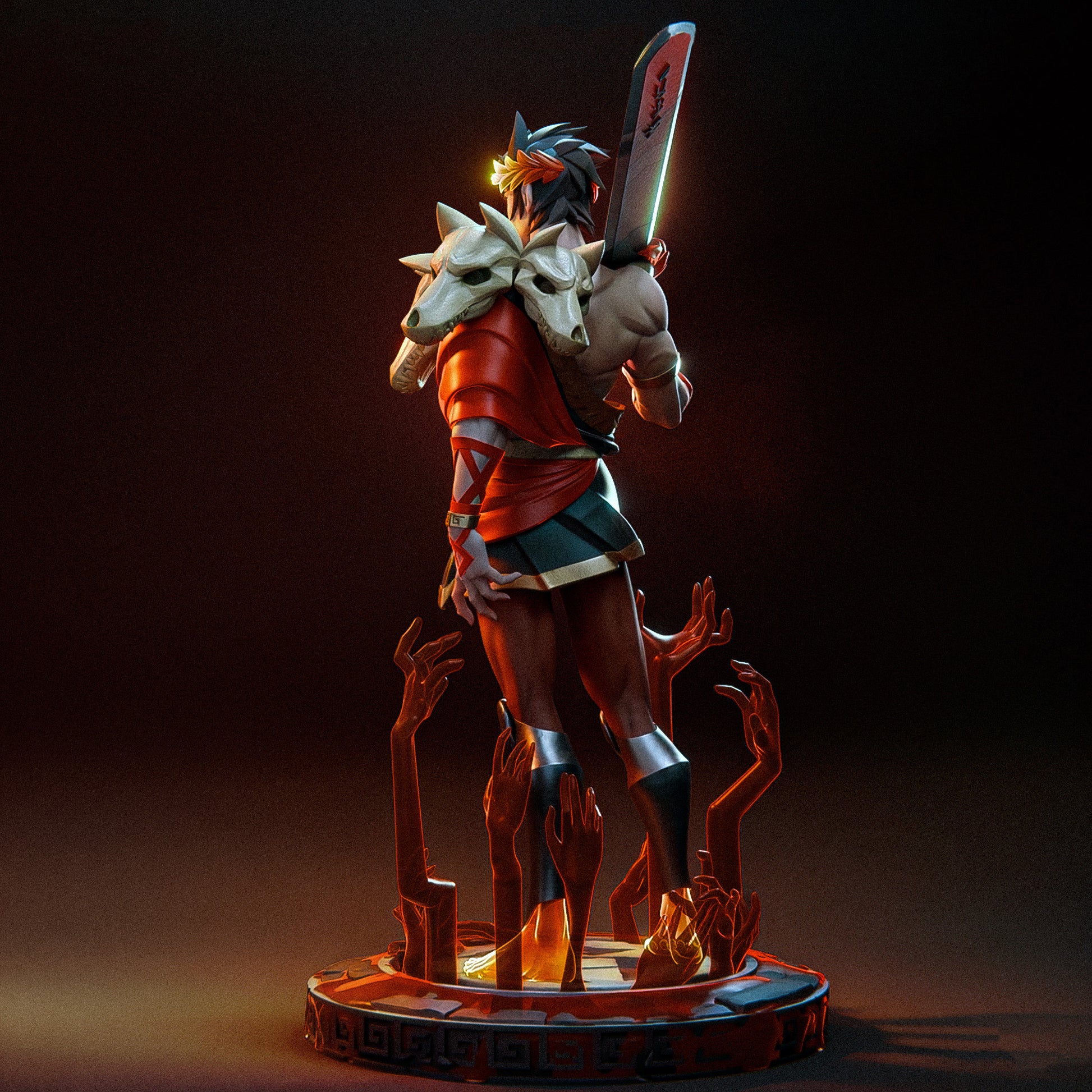 A premium resin collectable inspired by a determined warrior rising from the depths of the underworld in a beloved mythological roguelike game. Perfect for collectors and hobby painters who appreciate bold silhouettes, mythic details, and fiery-themed character design.