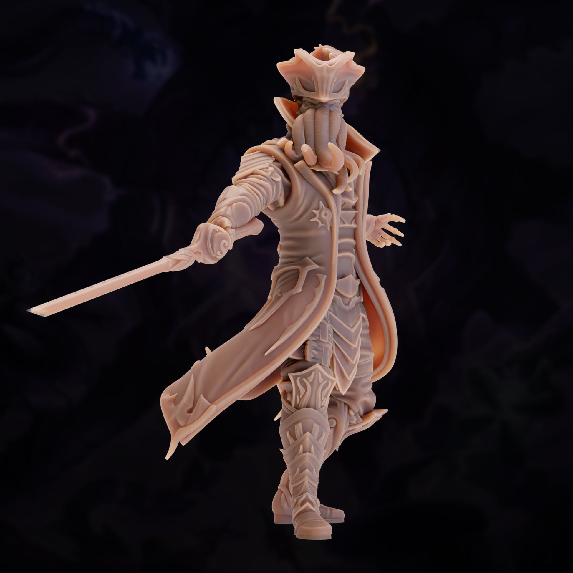 Sculpted in premium resin, the miniature emphasizes precise footwork, forward-leaning posture, and elegant weapon control, contrasting sharply with the alien horror of the illithid form. The poised “en garde” stance suggests intelligence, discipline, and lethal restraint, making this model ideal for high-stakes one-on-one confrontations or narrative-driven naval campaigns. A centerpiece miniature that blends intellect, elegance, and threat.