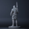 The figurine features sculpted leather and metal armour, a massive axe with engraved details, and a stern, battle-worn expression. The stance conveys raw power and stoicism without implying motion. Smooth resin surfaces allow for display or detailed custom paintwork.