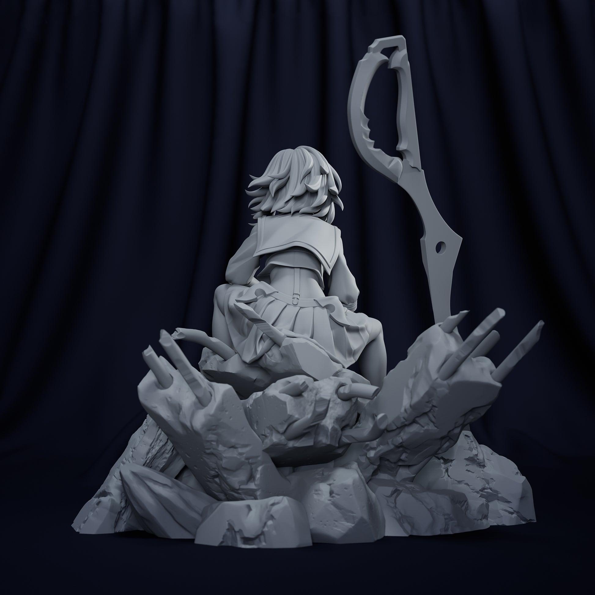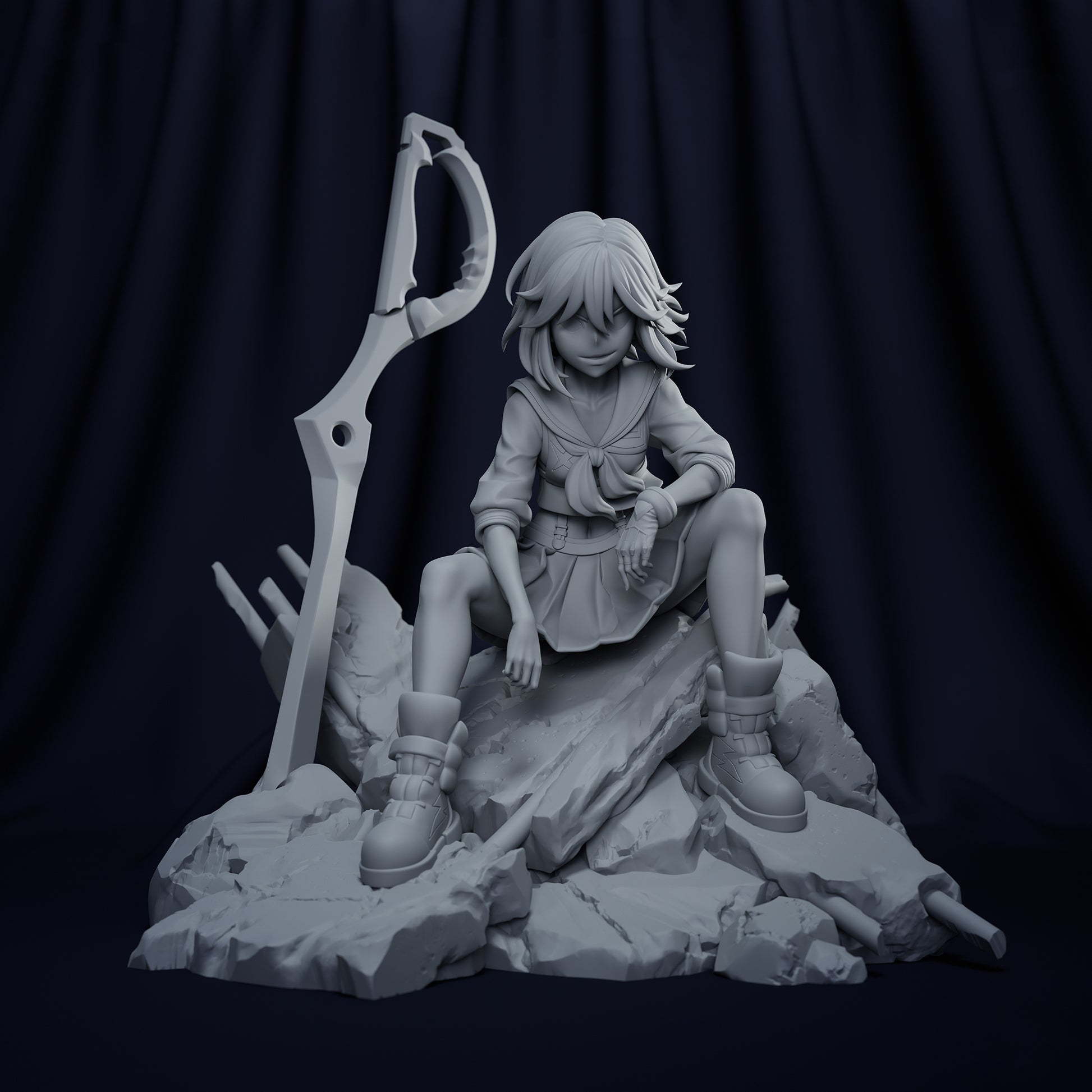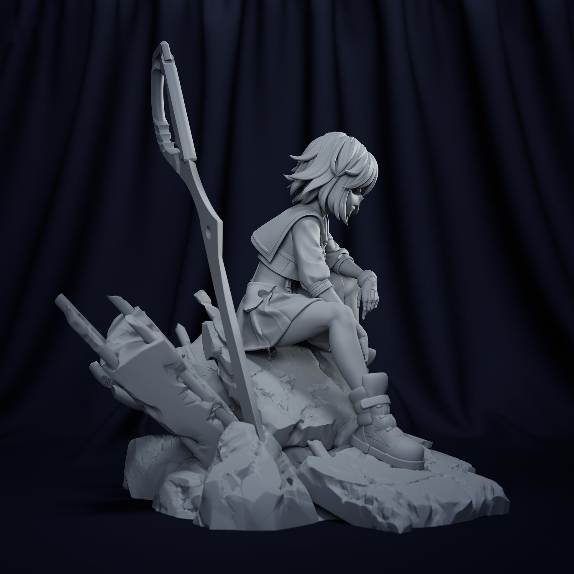 The figurine features a sculpted battle uniform with angular armor-like details, a massive scissor-blade weapon, and dynamic hair shaping—all rendered with crisp definition suited to resin. The stance focuses on presence and confidence while avoiding implied motion. Smooth surfaces allow for clean, vibrant paintwork.