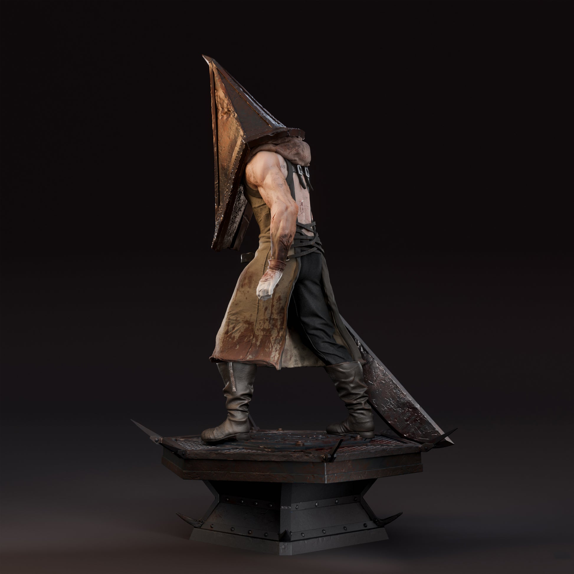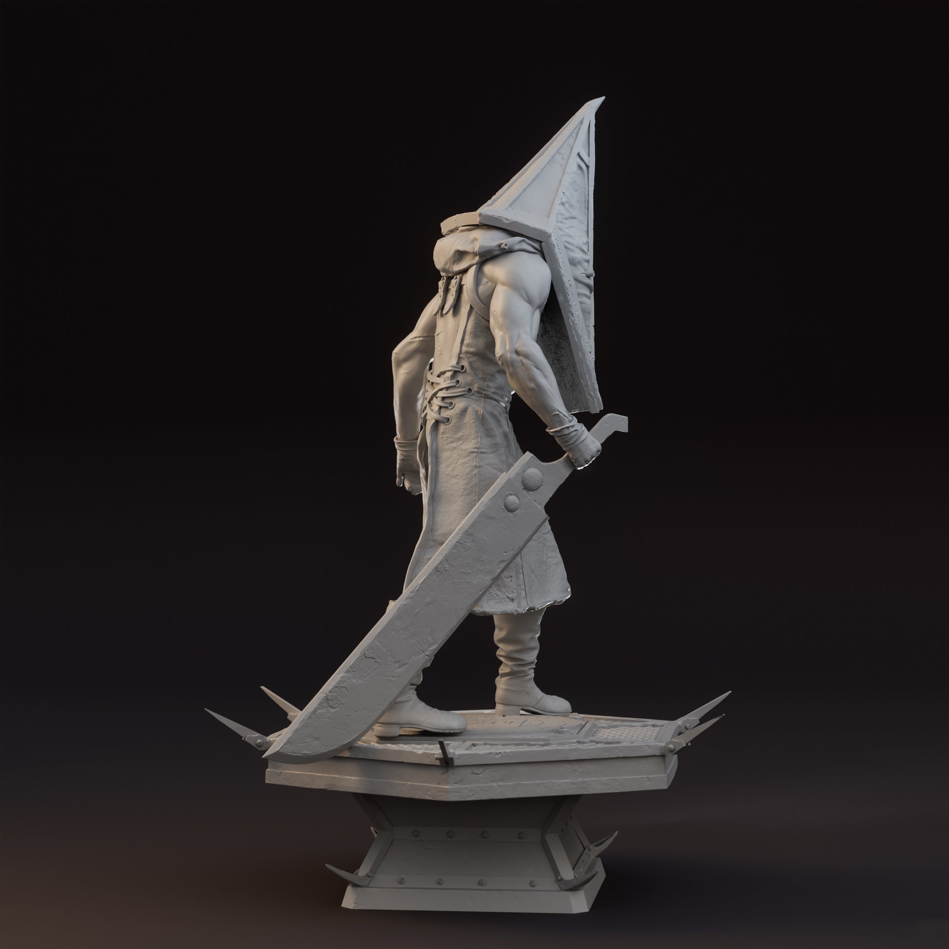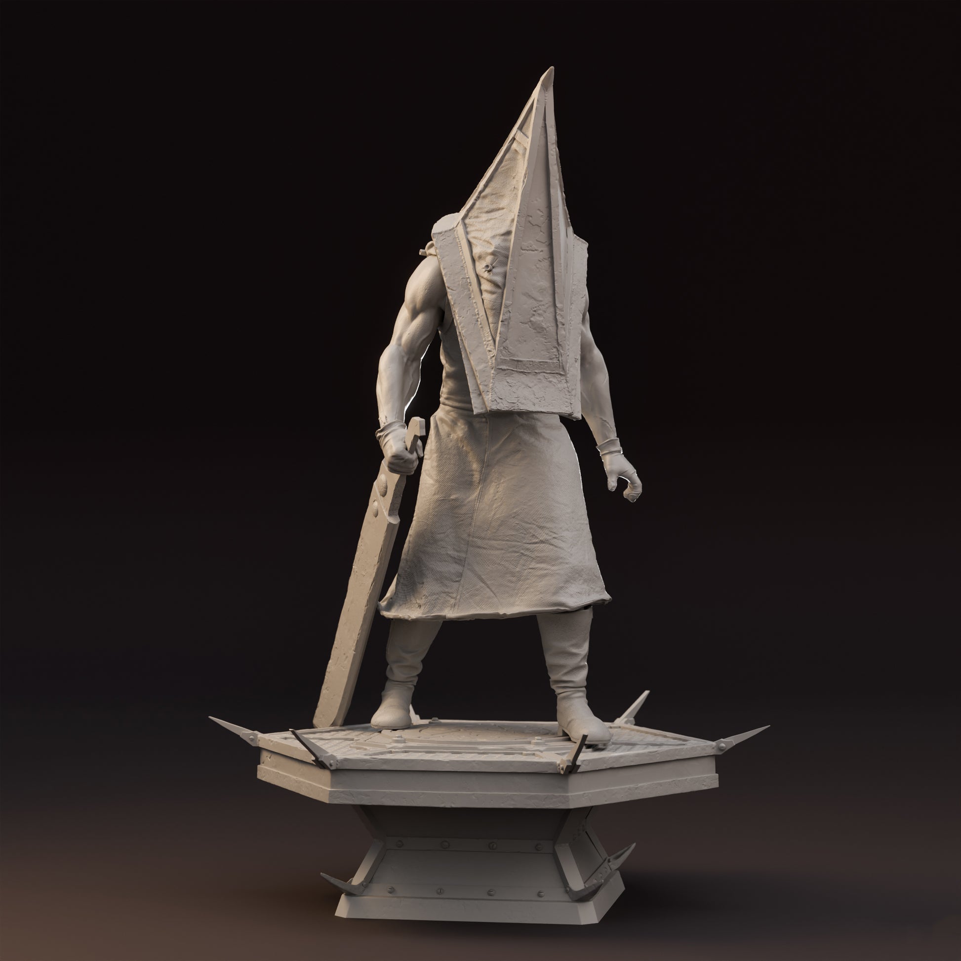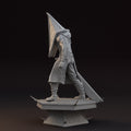 The figurine features the character’s signature pyramid-shaped helmet, tattered clothing, and imposing weaponry. Sculpted details convey a menacing presence, while smooth resin surfaces allow for display or custom paintwork, emphasizing the horror aesthetic.