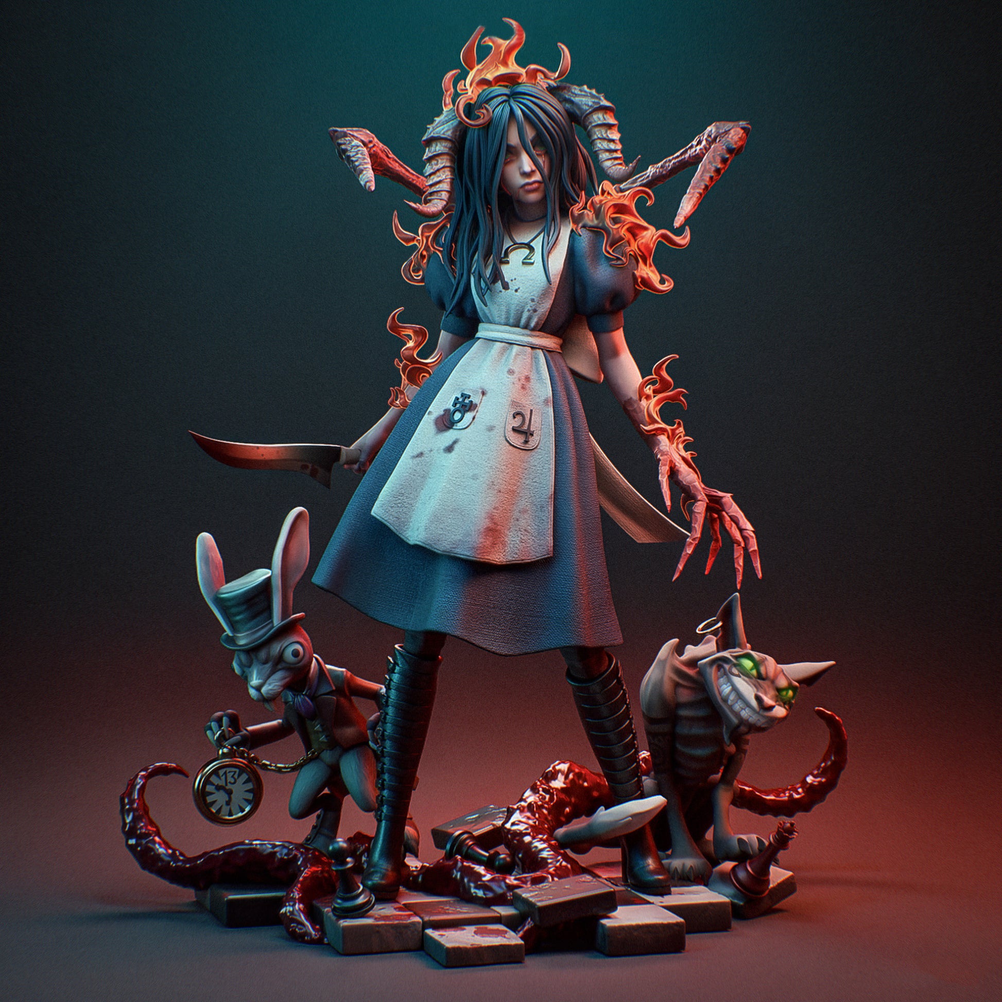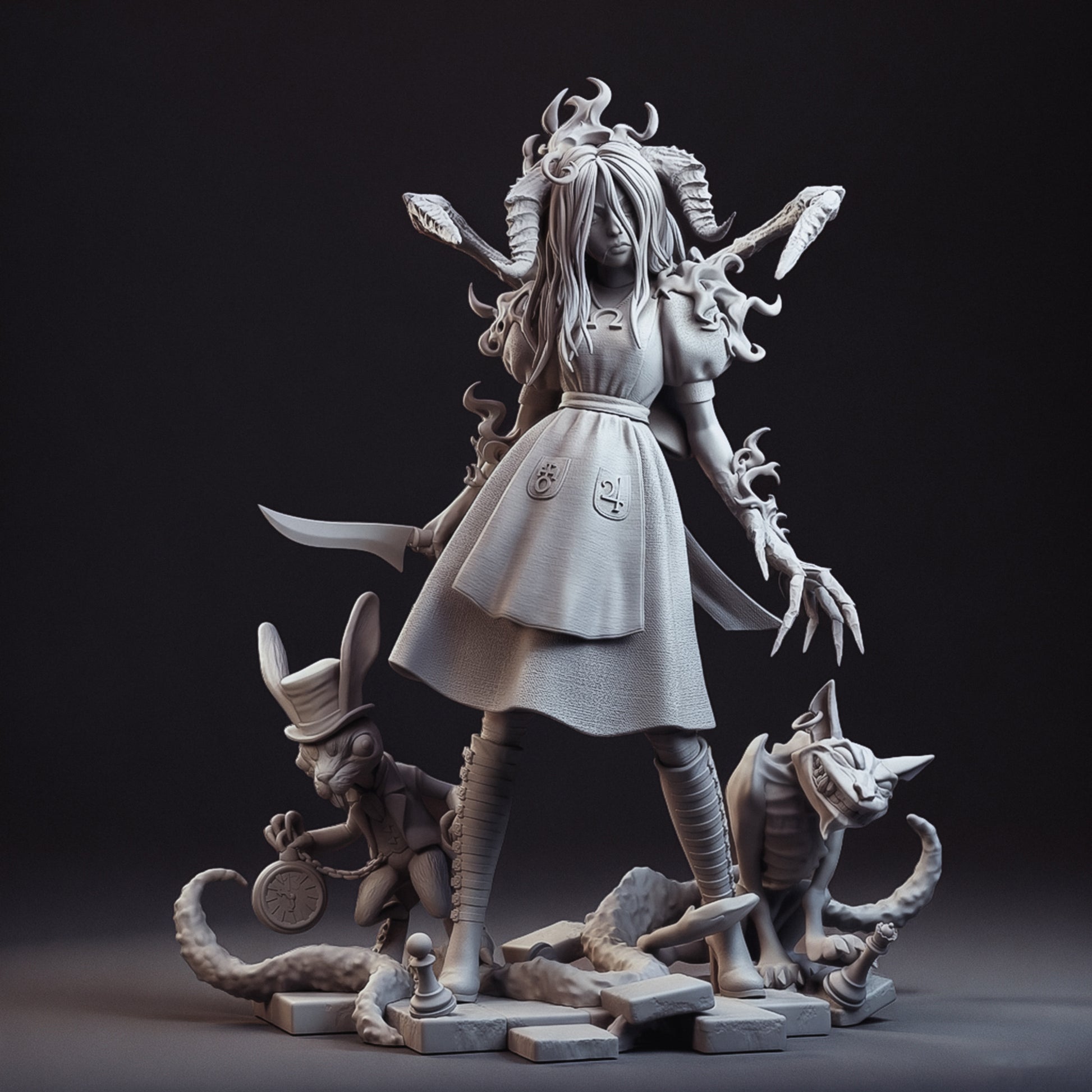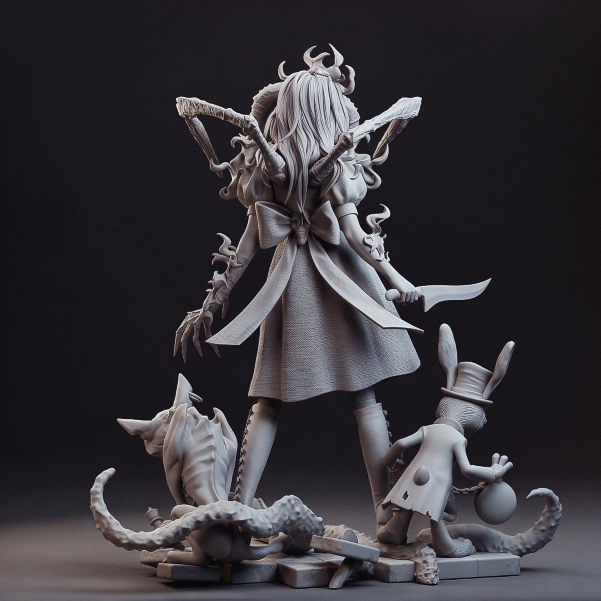 A premium resin collectable inspired by a dark, twisted version of a classic fantasy heroine. Designed for collectors and hobby painters who enjoy horror-fantasy aesthetics, detailed sculpting, and visually striking character designs.